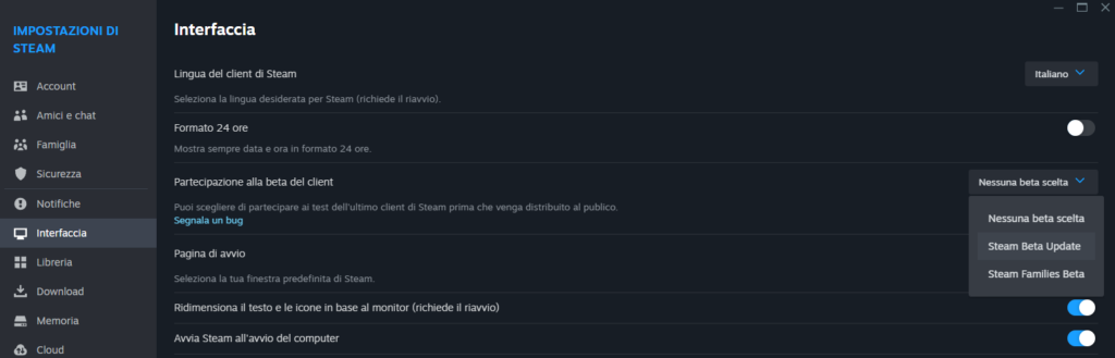 Per attivare la funzionalità, basta andare in impostazioni -> interfaccia e scegliere “Steam Beta Update” nella sezione dedicata.