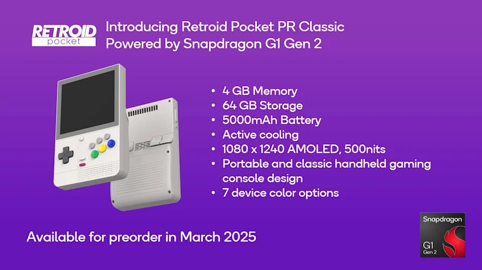 Ayaneo Pocket S2 arriverà a marzo 2025, e sfrutterà il chip più potente della gamma, avrà un display 2K da 6,3 pollici e la connettività Wi-Fi 7. Sempre nello stesso mese sarà disponibile anche la Retroid Pocket PR Classic, console portatile di ispirazione retro simile a un Game Boy, equipaggiata con Snapdragon G1 Gen 2, schermo AMOLED con risoluzione 1080×1240 e batteria da 5000 mAh.