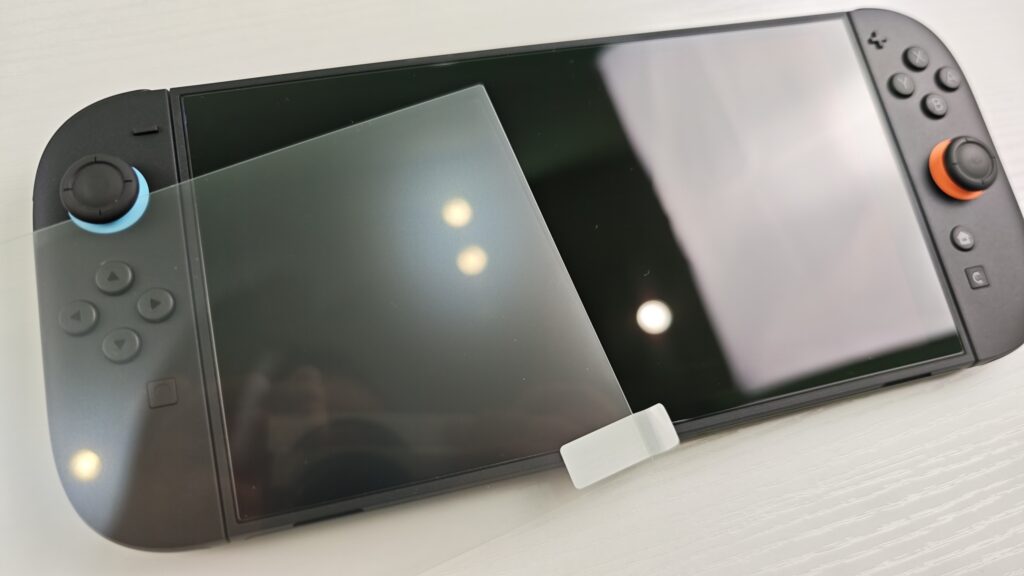 Il primo accessorio che abbiamo messo alla prova è il vetro protettivo opaco per Nintendo Switch 2 di JSAUX. Il contenuto del kit è davvero completo: all’interno troviamo ben due vetri, un applicatore in plastica, panni in microfibra, salviette imbevute e adesivi per rimuovere eventuali granelli di polvere.