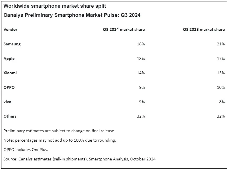 Nel terzo trimestre del 2024, Samsung e Apple si sono contese le vette di mercato in ambito smartphone, raggiungendo entrambe una quota di del 18%. Nonostante Canalys assegni un leggero vantaggio a Samsung, la competizione tra i due colossi รจ stata serratissima, con Xiaomi che perรฒ rappresenta una minaccia e si รจ posizionata al terzo posto con il 14%.