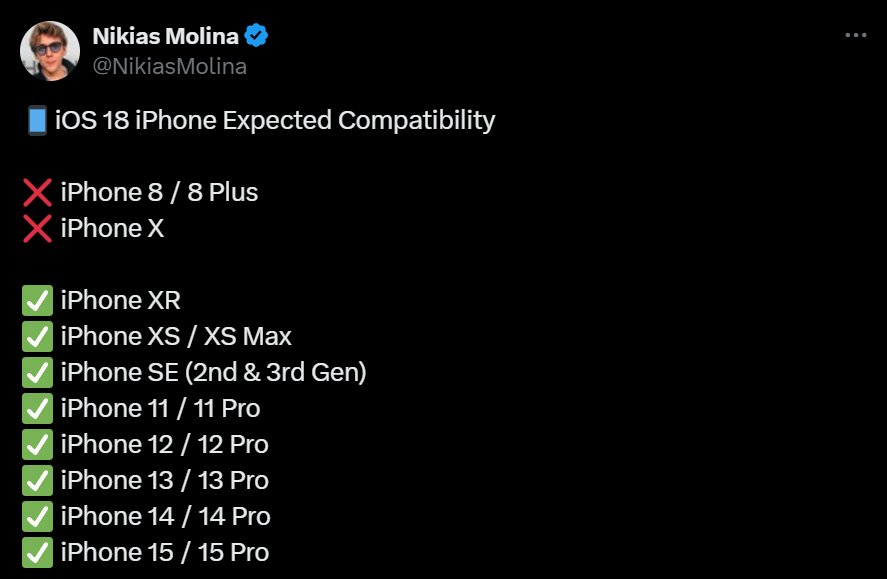 Nikias Molina ha lanciato nell’etere un twee… pardon, un post, che ipotizza quali saranno gli iPhone compatibili con iOS 18. Tralasciando gli ovvi modelli degli ultimi 2-3 anni, nell’elenco ci sono praticamente tutti gli iPhone che hanno avuto iOS 17.