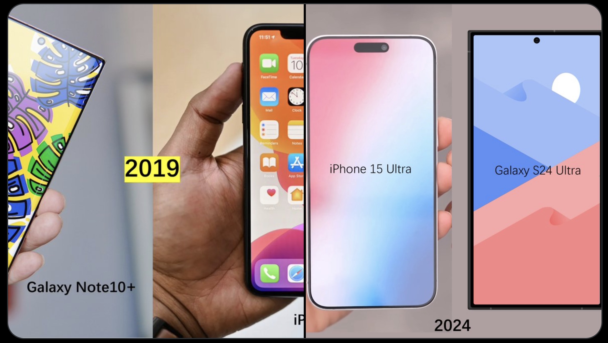 This world is so absurd. Four years ago, when I was holding a Samsung Galaxy Note10+ in my left hand and an iPhone 11 Pro Max in my right hand, I never thought that four years later, the bezel of the iPhone would surpass that of Samsung, and even more so many. pic.twitter.com/k4SoDlMfaG