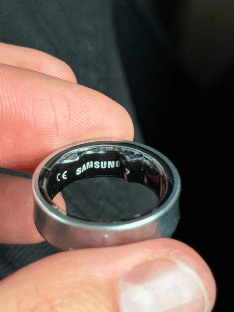 Le foto pubblicate online mostrano chiaramente l’interno del Galaxy Ring che si espandeva verso il dito, mentre l’esterno in titanio restava rigido senza lasciare alcuno spazio.
