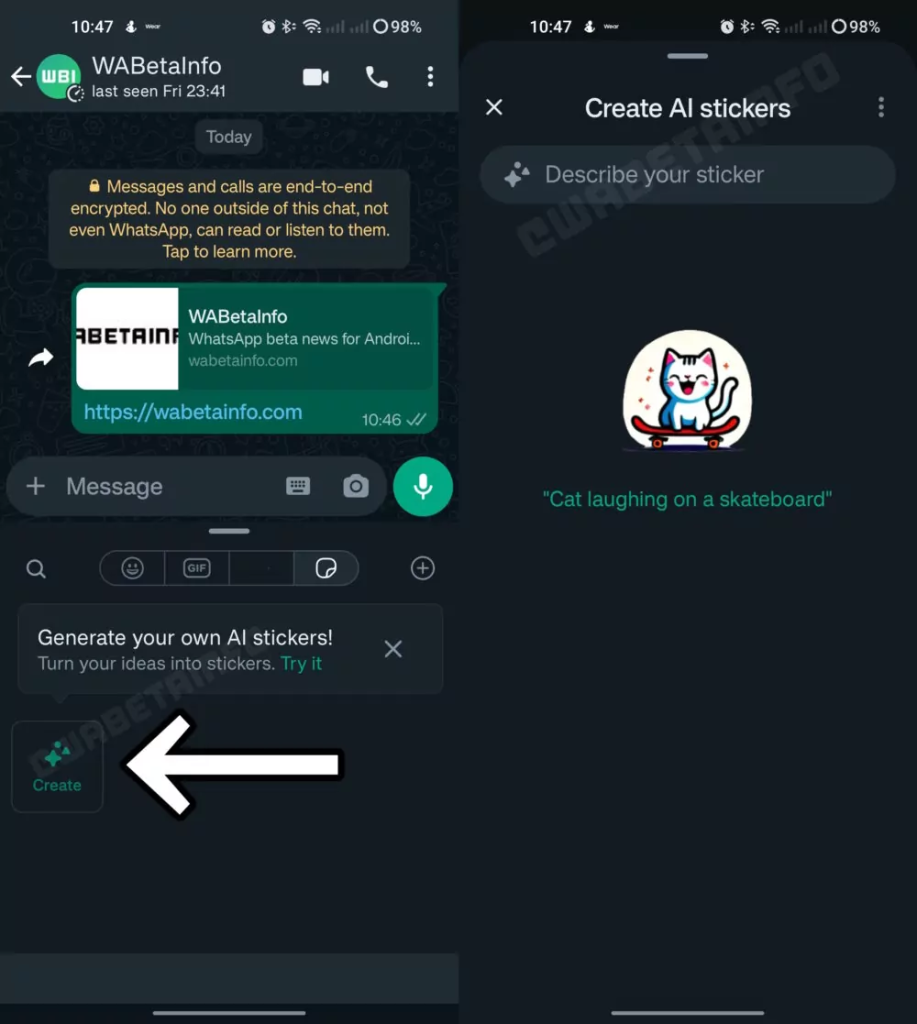 Il dettaglio emerso da WABetaInfo suggerisce che un gruppo selezionato di beta tester su Android ha già avuto accesso a questa intrigante funzionalità. Infatti all’interno della versione sperimentale dell’app è stato introdotto un pulsante denominato “Crea”, che guida l’utente verso una schermata dove può inserire delle richieste specifiche. In base a queste, l’AI propone un adesivo personalizzato, pronto per essere condiviso con i contatti.